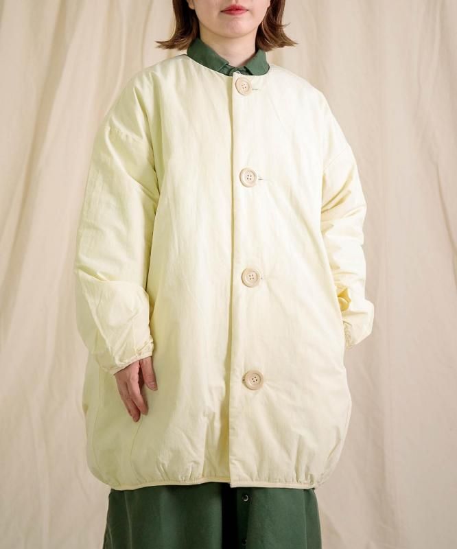 ゆとりのあるサイズ感なので、中にスウェットなどを着込んでも表に響かず着れそうです。裾にかけてのボリューム感と襟元はノーカラーでスッキリとしているメリハリのあるデザインでデイリーにも使いやすい癒し系アウターです。