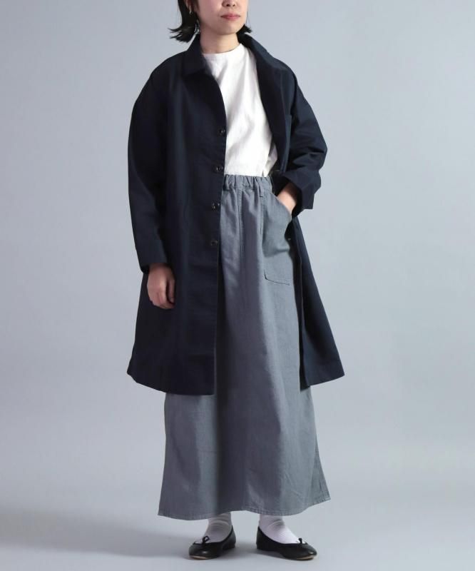 カバーオールとショップコートを掛け合わせた、膝丈のほどよくバランスのとれた丈感で、ざっくり羽織れるオーバーコートに仕立てています。